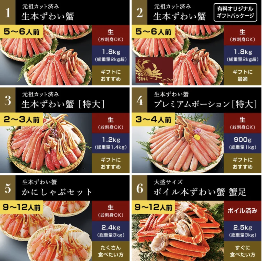 年間10万箱以上を販売する大人気商品「元祖カット済生ズワイガニ」をはじめ、カニ専門店として長年培ってきた目利きで、良質なカニを多数取り揃えています。