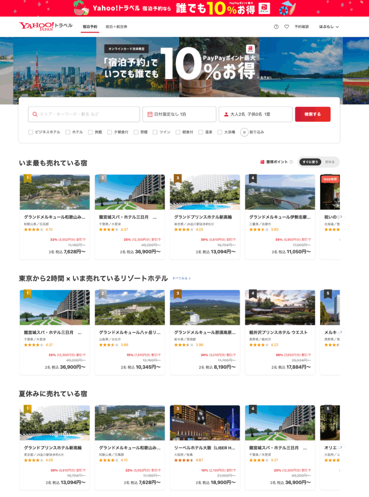 リーズナブルな価格での宿泊施設から贅沢な宿泊施設まで掲載しており、 日程や希望の条件からプランを簡単に検索・比較できます。 お得なキャンペーンやクーポンの配布あるようですよ。